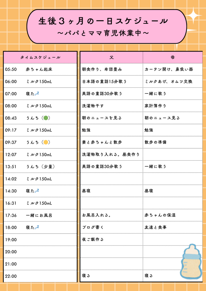 ・完全ミルクの我が家の生後3ヶ月のリアルな一日のスケジュールを表付きで